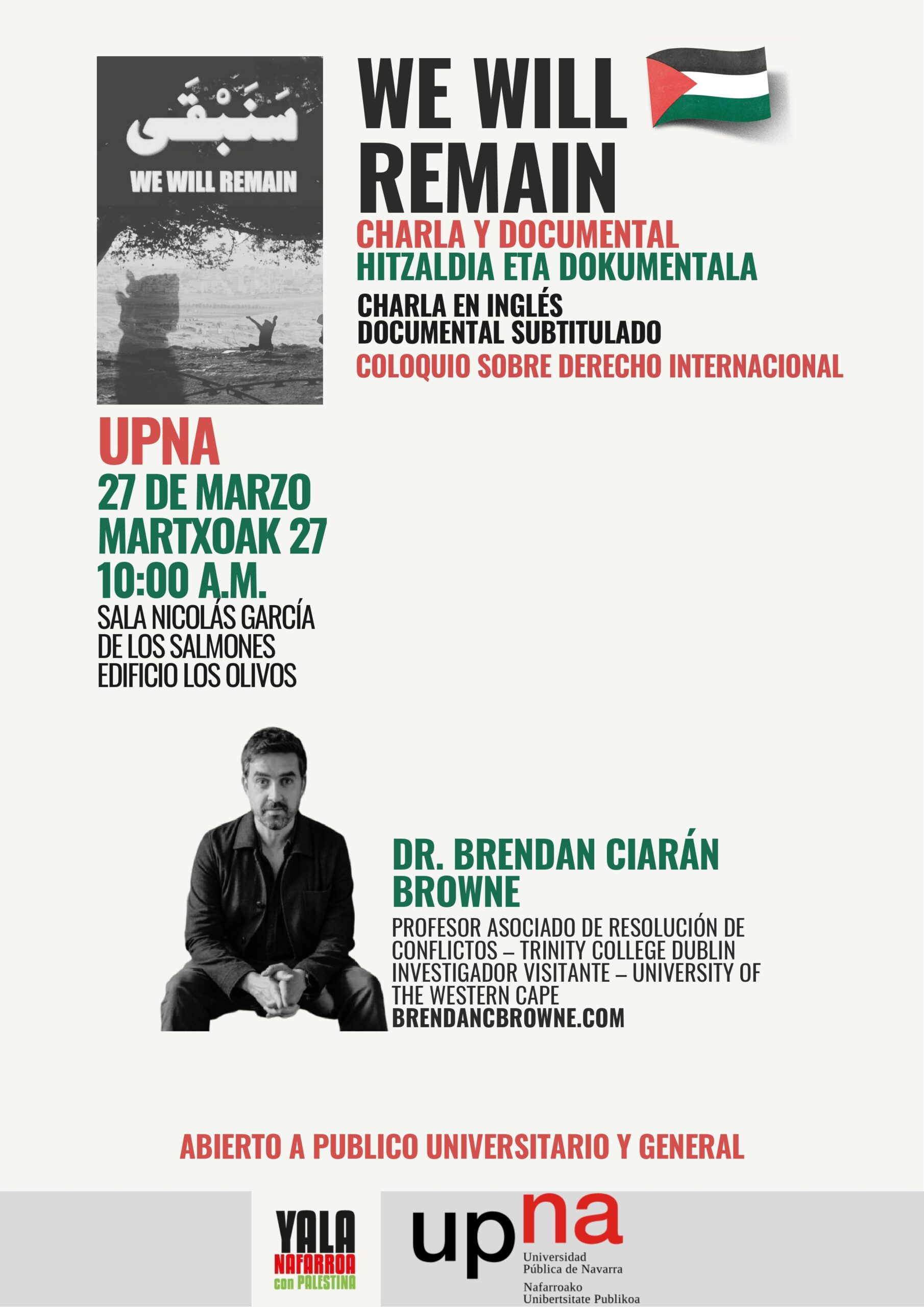 Se proyectará el documental «We will remain» y habrá un coloquio sobre derecho internacional.