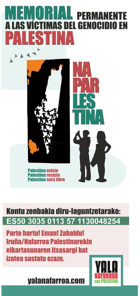 Yala Nafarroa Palestinarekin herri ekimena Palestinako genozidioaren biktimak oroitzeko memorial iraunkor bat jartzea sustatzen ari da. Yalatik adierazi dutenez, ekimena ahalik eta herrikoiena izatea eta harpidetza herrikoiaren bidez finantzatzea da asmoa. Obra Josu Rada diseinatzailearena da, eta modu altruistan laguntzen du.